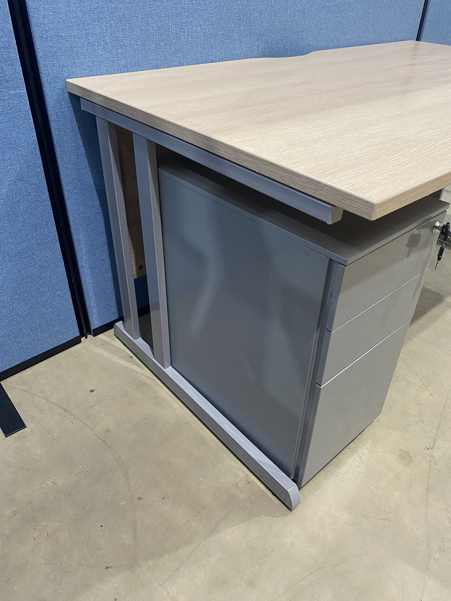 Save money with our desk, drawers and chair package deal. The desk has a used top which is in very good condition but the leg frame is brand new. The mobile pedestal is also used and in good condition but the high back task chair is also new. Combining both new and used products enables us to create a great low price package deal.