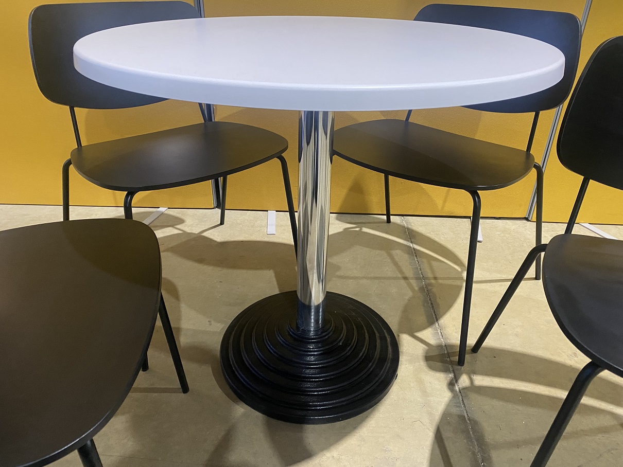 Used round canteen table with a white Werzalit top, chrome column stand and a black metal base. The chairs have a wooden seat and back finished in black with a black 4 legged metal frame.